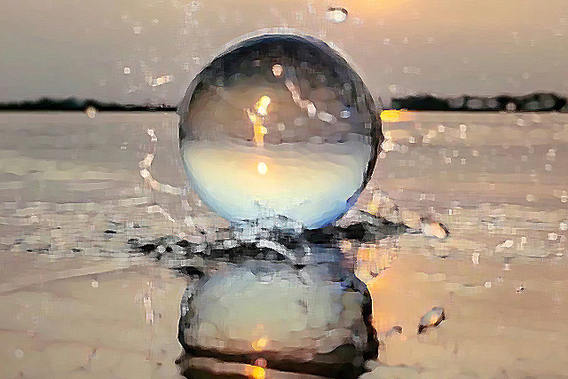 Je suis le reflet d’une goutte éphémère, au dôme miroitant de milliers de couleurs, de milliers de nuances, incarnée d’or et de rouge flamboyant, de blanc, de gris, de noir, de vert et de bleu irradiant, et dans toutes ces tonalités, je me confonds.